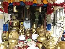 Prior to the introduction of European-styled clothing, the Efik wore loin clothes made of Raffia (Efik: Ndam).[77] The fibre of the leaf-stalk of a palm was made into a thread and woven to make clothes and bags.[78] Raffia palm clothing (Efik: Ọfọñ Ndam) could also be exported from other communities especially when a community made the best raffia clothing.[79] Ikpaya a royal type of gown also made from raffia. Ikpaya is now worn by an Obong-elect during the traditional coronation ceremony.[77] Women wore a number of brass rings on their legs and arms.[80] Ivory bracelets (Efik: Mme) were worn by wealthy women.[81] With the inception of the transatlantic slave trade, a number of foreign clothes were introduced into Efik society. Oral tradition holds that a type of clothing known as "Itu ita" was the earliest fabric imported into Old Calabar. This material is believed to have been imported by the Portuguese (Oboriki).[82] The Portuguese are said to have arrived in masted ships.[82] The name Itu ita translates to three manatees and is named because the masts of the ship resembled the manatee (Itu). Some other clothings introduced into the market include smit, brutanya, isadọhọ and nkisi. The missionaries who arrived in 1846 contributed to the changes in women's attire in Efik society. Several types of English dresses were introduced to Efik women such as the Victorian dresses known in Efik as Ọnyọnyọ. Over the years, the Victorian dress has been modified and given what is regarded as a dignified African look. In modern-day Efik society, Ọnyọnyọ is worn on various occasions such as weddings and traditional events. The dress is often worn with ornaments such as necklaces and earrings made of coral beads. During weddings, the bride wears at least two different Ọnyọnyọ. The traditional attire for men usually consists of a white long-sleeved shirt, a long broad soft neckerchief or scarf of costly material (Efik: Ọkpọmkpọm) and a wrapper tied around the waist (Efik: Usobo).[83]