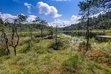 The mire lake with an area of 9.35 hectares is completely surrounded by floating grass. Due to its location in the midst of a vast moor his water colour is deep brown. The acidic waters are surrounded by quaking bogs, mostly of peat mosses. Sundews, bladderworts, alpenrose, hare's-tail cottongrass, bog-rosemary, and bog billberry also occur. All stages of bog formation can be observed on Egelsee. The local fauna include cyclops copepods as well as common frogs and water frogs, with large spawn clusters covering the shoreline water surface in spring. Originally there were no fish in this lake.
