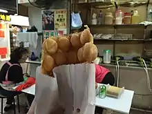 The origins of the egg waffle or gai daan jai (which literally translates to "little chicken egg") are unknown, despite being ingrained in the memories of Hong Kong residents young and old. One story says the enterprising post-war generation created the egg-shaped mold to make up for an eggless batter, as eggs used to be a luxury. Another tale points to street hawkers who bought damaged eggs on the cheap to work them into a batter, resulting in the classic golden color of the cake. It also is reasonable to suggest that the special iron skillet used to mold the gai daan tsai is a Hong Kong take on the traditional checkered European waffle press. Today, the two related snacks are often sold by the same stall.[1] There is also another tale that it originated from the 1950s, when a sundry shop owner did not want to waste broken eggs and tried to add flour, butter etc. and baked it in a mold.[8] However, in 1944, Mr Cheung, the founder of a food stall, began using a cart to sell daan jai kau which is the predecessor of egg waffle. Daan Jai Kau is bigger than an egg waffle, and it is often divided into 30 pieces for selling by the hawkers.[9][10]