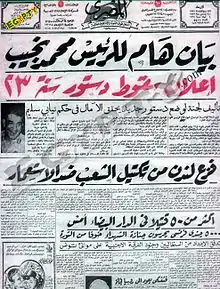 The Constitution of 1923 was a constitution of Egypt from 1923–1952.[1] It was replaced by the Constitution of 1930 for a 5-year period from October 1930 before being restored in December 1935.[1] It adopted the parliamentary representative system based on separation of and cooperation among authorities. The Parliament of Egypt was a bicameral system made up of the Senate and the Chamber of Deputies.