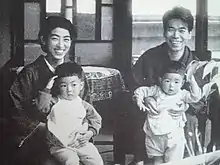 Yoshikawa family. Fumiko Ikedo holds her first son Hideaki and Eiji Yoshikawa holds his second son Hideho.