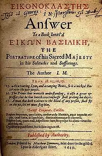 Eikon Basilike was published just after Charles I's execution, and the work portrayed him as a martyr. The piece was written with straightforward political aims, to stir up popular sentiment in support of the former monarch and to undermine the control of the Commonwealth government. The work proved so popular that there were 35 editions produced that year. Milton's approach was different from that of Eikon Basilike, which may have in fact been a composite work with John Gauden involved in ghostwriting: instead of appealing to popular sentiment, Milton's work was closely argued and tried to meet each of the points in the Eikon.[1][2]
