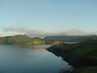 There are two peaks at either end of the island, with the low ground in the middle. There are two lochans in the west, and three in the east as well as a number of burns.