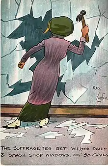 Casey was inspired by Emmeline Pankhurst who she saw at a rally. After this she became a member of the Women’s Social and Political Union, and was considered super-militant.[2] In 1911, Casey was one of those involved in WSPU’s Window Smashing Raid in London, she escaped being arrested while over 213 fellow suffragettes were arrested.