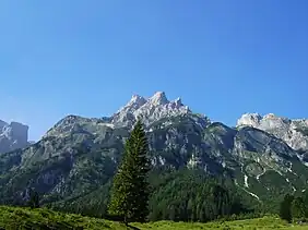 The Eiskogel (2,321 m (AA)) is one of the best known peaks in the Tennen Mountains (Tennengebirge) which are part of the Northern Limestone Alps in the state of Salzburg. On its south and west sides the mountain has rock faces up to 1,000 metres high. By contrast, to the north and east it descends relatively gently down grass and schrofen slopes to the broad plateau of the Tennen Mountains.