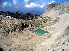 The Lower Eissee (German: Unterer Eissee) lies at 1,909 m (AA)[1] in a shallow cirque, the Taubenkar. It was left behind by the melting of the Hallstätter Glacier that, until the middle of the 19th century, still extended as far as the doline of the upper Taubenkar.[2] When the glacier retreated (today its snout lies at about 2,200 m), the Lower Eissee was left behind in the basin, because the moraine gravel is lined with limestone silt. For a long time after it had been formed, roughly to the turn of the century, large fields of dead ice could be found on its shores, but today they have disappeared. The Lower Eissee has neither aboveground headwaters nor tailwaters.[2][3]