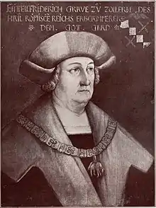 Eitel Friedrich II, Count of Hohenzollern (c. 1452 – 18 June 1512 in Trier, Electorate of Trier) was a count of Hohenzollern and belonged to the Swabian line of the House of Hohenzollern. He was the first president of the Reichskammergericht. As a close friend of the Archduke and later Emperor Maximilian I, he gained great influence in the imperial politics. He managed to consolidate and expand his own territory.