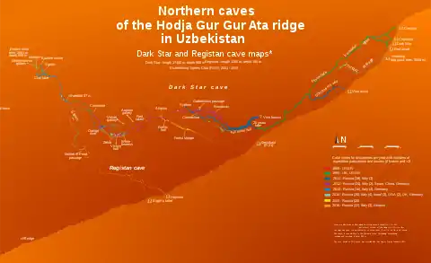 Surprisingly the lakes in the cave were still frozen and cavers were able to resume exploration where the Brits stopped in 1990. 1500 m of new large tunnels were discovered, a new entrance, Vino rosso, the cave also connected to Iževskaja, which enabled easier access to deeper parts of Dark Star. The cave now had 6 entrances and its depth reached 300 m. The third team, tasked with explorations in Festival'naja cave, found out that the bottom of the cave is without continuation, but they found a higher continuation in "Salavat universe", which yielded 2 km of new tunnels, including a very large hall "Everest". The survey showed that the connection to other caves of the Southern group, Jubilejnaja, Berloga, and Učitel'skaja caves was within reach.[25][31] In 2012 SGS, with the support of the Association of Cavers of the Urals, launched the largest expedition so far, with 29 participants from Russia, Italy, Spain, China, and Germany of which 10 were girls, very skillful in cave survey. They worked in 3 caves: Ulugh Beg, Festival'naja, and Dark Star. In the first one cavers needed 3 days to break through the ice-blocked tunnel but discovered new parts which ended in the mountain wall, with a new, easier cave entrance. On the plateau on the ridge, several caves were found which ended with impassable narrows. In Festival'naja cave 2 km of new tunnels were found, 1 km of which was also surveyed, and a surface survey was made which connected the cave entrance to entrances of Jubilejnaja and Berloga. In the Dark Star normal route was again impassable, lakes were full of a slurry of water and ice. The connection to Iževskaja cave, discovered in 2011, made the access possible. The team made important new discoveries, cave depth increased to 600 m, there were 6 km of new tunnels surveyed, several possible continuations remained. Samples were also taken and sensors were installed to help determine the paleoclimate of the area.[25][32][33][34] An expedition result rarely surpassed in deep cave exploration.[35] In 2013 a Russian-Italian-German team of 21 managed to substantially deepen the cave, to the level around 900 meters below the top entrance. They also discovered around 40 m high waterfall at a depth of 750 m.[36][37] Previous achievements attracted the largest ever SGS expedition to Hodja-Gur-Gur-Ata in 2014, of 31 people from 6 countries which included a National Geographic photo team.[38][2] A team of 4 set up camp on the ridge plateau, at an altitude of 3700 m. They surveyed a surface trek from above the Red dwarf entrance to the bottom of Dark Star. The elevation difference between the cave tunnels and the surface gradually increased from 150 m to 250 m. There were no visible tectonic faults along the way, above the cave bottom there was a small canyon on the surface, which ran in the direction of a lake, situated at an altitude of 2400 m. This fact would reduce the cave depth potential from 2100 m to 1100 m. The team also inspected the terrain from the cave area to the group of canyons close to the top of the mountain at an altitude of 3921 m. No potential cave entrances were found. They also checked the cave R-20 which closed soon. The Dark Star team examined the bottom of the cave, at a depth of 900 m, and concluded that the karst rock strata (limestone) came into contact with poorly soluble and non-karst strata such as shale and sandstone. Any advancement to greater depths would require extensive digging. The team discovered many new tunnels, of considerable length, following several small water flows in the upstream direction.[38][39] In 2015 an SGS and ASU expedition of 26 was divided into three teams, the largest, 14 cavers, departed to Dark Star cave and the other two to Boybuloq cave, water springs below its terminal siphon and to the plateau above the cave. At the Dark Star bottom, the team tried to push through boulder chokes and previously impassable meander tights. To no avail, any reasonable effort to get through would have to involve large-scale mining. There was progress in the higher levels of the cave, new tunnels decreased the distance from the nearest cave of the Southern group (Isetskaja) to 800 m.[40][41][42] In 2016 the 26-strong Russian-Italian-Ukrainian expedition worked mainly in Chul-Bair. One team however departed to Hodja-Gur-Gur-Ata ridge to try to connect the Northern and Southern caves through Isetskaja cave, to check possible new cave entrances in the mountain wall, and to advance in the upper levels of the cave. In Isetskaja cave a meander, leading to the closest Northern group cave, Iževskaja, was discovered. Soon after its beginning, the meander turned away, towards the inside of the mountain. Through the entrance R-20, which is not far from Iževskaja cave entrance, cavers advanced 1300 m far and 190 m deep into the mountain, to 100 m of the nearest point in Dark Star. They renamed the cave to Registan. Progress was also made in the Dark Star, in the Forest steppe tunnel.[43] Further work on Hodja-Gur-Gur-Ata was put on hold, all the efforts were directed to the Višnevskij cave.