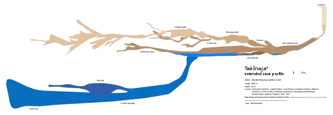 In 2019 it was difficult to assemble the expedition as there was no clear continuation, but when cavers from Moscow and Irkutsk also joined in, a group of 15 gathered. Four: E. Sakulin, P. Kovešnikov, A. Janina, and A. Minogin departed to the bottom, to find an eventual continuation in the ascending tributary at −600 m. But on the first day at the bottom, Sakulin and Janina crawled through a narrow, half-flooded passage and found a siphon bypass. Other plans were scrapped and the team, reinforced with E. Rybka, V. Samsonov, and V. Loginov (called through a phone connection to the surface), set off to the new part. A wide meander with a stream at the bottom continued until the stream disappeared below the dripstone floor in a narrow passage, above which the "Big gallery" began. A low crawl with a wet clay floor followed. After two hours the "Big Collapse Hall" opened up, followed by a meander with a small stream, a passage, and a beautifully colored meander named "Amber River".[45] It joined a larger inflow, most likely the main stream which disappeared before the "Big Gallery". On a shelf under the ceiling of the junction hall, "Aquapark", the last camp was set up. An even larger meander followed, and several 10 m pits. Because of lack of time and rope, the party stopped on top of another 20 m shaft, after which one more pit was visible. The cave ran steadily in the direction of a cascade of pits in the New Branch of Boybuloq. It was deepened to 1131 m and prolonged to 8004 m.[45][53][46][54][55]