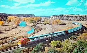 In its first year and a half the El Capitan ran at 80% capacity, superior to similar services. Reservations had to be made weeks in advance.[3] In 1942 the consist expanded to 12 cars. Heavy traffic during World War II forced the Santa Fe to lengthen the train's schedule by two hours in July 1942; it restored the old schedule on June 2, 1946.[4] On September 29, 1946, the El Capitan began running every other day, departing Los Angeles and Chicago on odd-numbered days (except the 31st). Together with the Super Chief on even-numbered days, the two trains formed what the Santa Fe billed as "the first and only daily 39+3/4 hour service between Chicago and California".[5] On January 25, 1948, one of the locomotives assigned to the El Capitan crashed through a steel bumper post and concrete wall at Los Angeles' Union Passenger Terminal, ending with the locomotive dangling about 20 feet above Aliso Street.[6] In 1948 the Santa Fe received additional equipment which permitted the Super Chief and El Capitan to start operating daily; the new schedules went into effect on February 29.[7] The extra-fare charges were dropped from both El Capitan and the Chief on December 14, 1953.