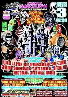 Starting as far back as at least 2002, the Mexican wrestling promotion International Wrestling Revolution Group (IWRG; Sometimes referred to as Grupo Internacional Revolución in Spanish) has held several annual events where the main event was a multi-man steel cage match where the last wrestler left in the cage would be forced to either remove their wrestling mask or have their hair shaved off under Lucha de Apuestas, or "bet match", rules. From 2005 IWRG has promoted a fall show, around the Mexican Day of the Death, under the name El Castillo del Terror ("The Tower of Terror") to distinguish it from other Steel cage matches held throughout the year such as the IWRG Guerra del Golfo ("Gulf War"), IWRG Guerra de Sexos ("War of the Sexes") or IWRG Prison Fatal ("Deadly Prison") shows. The Castillo del Terror shows, as well as the majority of the IWRG shows in general, are held in "Arena Naucalpan", owned by the promoters of IWRG and their main arena. The 2011 Castillo del Terror show was the seventh year in a row that IWRG promoted a show under that name.