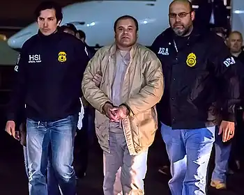 Guzmán was first captured in 1993 in Guatemala and was extradited and sentenced to 20 years in prison in Mexico for murder and drug trafficking.[3][14] He bribed prison guards and escaped from a federal maximum-security prison in 2001.[3] His status as a fugitive resulted in an $8.8 million combined reward from Mexico and the U.S. for information leading to his capture,[3] and he was arrested in Mexico in 2014.[11][15] He escaped prior to formal sentencing in 2015, through a tunnel dug by associates into his jail cell.[16] Mexican authorities recaptured him following a shoot-out in January 2016,[17] and extradited him to the U.S. a year later. In 2019, he was found guilty of a number of criminal charges related to his leadership of the Sinaloa Cartel,[18] was sentenced to life imprisonment, and incarcerated in ADX Florence, Colorado, United States.[19][20]