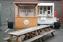 El Gallo Taqueria was a Mexican restaurant in southeast Portland's Woodstock neighborhood. The Oregonian's Ben Waterhouse described the restaurant as "tiny but charming, finished in weathered boards with tabletops milled from wind-fallen maple trees salvaged from the canyon" at nearby Reed College. He wrote, "You won't get a very good view of the woodwork, though, because all the space not devoted to the kitchen, where three men in black t-shirts, aprons and baseball caps busily crank out tacos and burritos, is packed elbow-to-elbow with people eating or waiting to eat. If you linger, you can bet another customer is wishing death and dismemberment upon you."[1]