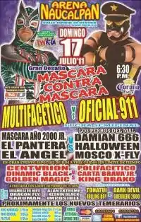 For the main event Lucha de Apuestas match Oficial 911 was accompanied by the most recent addition to the Los Oficiales group, Oficial Spartan. Multifacético had Pantera work as his corner man, trying to keep Los Oficials in check. During the match, Multifacético won the first fall, but lost the second and third fall, the last one when Oficial Spartan helped his tag team partner cheat. Oficial AK-47 and Oficial Fierro, joined in the in-ring celebrations as Multifacético was forced to unmask. After unmasking Multifacético revealed that his real name was Jonathan Pacheco, that he was from the State of Mexico and had been a professional wrestler for seven years at that point in time.[1][11] He had previously wrestled under the name "Magia Negra" ("Black Magic").[12]