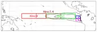 Currently, each country has a different threshold for what constitutes an El Niño event, which is tailored to their specific interests.[16] For example, the Australian Bureau of Meteorology looks at the trade winds, SOI, weather models and sea surface temperatures in the Niño 3 and 3.4 regions, before declaring an El Niño.[17] The United States Climate Prediction Center (CPC) and the International Research Institute for Climate and Society (IRI) looks at the sea surface temperatures in the Niño 3.4 region, the tropical Pacific atmosphere and forecasts that NOAA's Oceanic Niño Index will equal or exceed +.5 °C (0.90 °F) for several seasons in a row.[18] However, the Japan Meteorological Agency declares that an El Niño event has started when the average five month sea surface temperature deviation for the NINO.3 region, is over 0.5 °C (0.90 °F) warmer for six consecutive months or longer.[19] The Peruvian government declares that a coastal El Niño is under way if the sea surface temperature deviation in the Niño 1 and 2 regions equal or exceed 0.4 °C (0.72 °F) for at least three months.