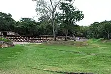 The North Ballcourt is constructed by three layers of large flagstones. There are six carved panels with ritual scenes and an ornamental frieze that runs along both walls. The court is 87 feet (27 m) long, which is considered to be unusually small and has vertical rather than sloping walls. It is probably one of the oldest structures at Tajín.[54]