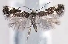 The wingspan is 8–9 millimetres (0.31–0.35 in).[1] The head is white with a conspicuously whitish forehead. Forewings are blackish ; a somewhat oblique fascia before middle, sometimes interrupted, a tornal spot, and a rather larger triangular costal spot beyond it white. Hindwings dark grey.The larva is yellow-whitish; head pale brown; 2 with three rows of brown dots.[2]