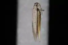 The wingspan is 8.5-9.5 mm. The forewings are dull white. The base of the costa is fuscous and the wing is slightly dusted with pale ocherous fuscous-tipped scales. The hindwings are pale gray.[2] Adults have been recorded on wing in June.