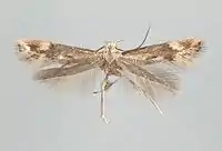 The wingspan is 7โ8 millimetres (0.28โ0.31 in).The head is grey. Forewings are grey ; plical stigma black, preceded and followed by whitish marks ; a small tornal spot, and an oblique wedge-shaped mark on costa opposite whitish. Hindwings are dark grey.[1]