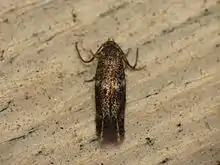 The wingspan is 7–8 millimetres (0.28–0.31 in).The head is dark grey, whitish-sprinkled, face paler or whitish. Forewings are blackish, somewhat paler-sprinkled ; an oblique fascia before middle, in male indistinct and sometimes interrupted, a tornal spot, and an opposite costal spot (appearing together to form a perpendicular interrupted fascia) whitish, in female whiter and more distinct. Hindwings are grey. The larva is pale yellowish-grey ; head black or pale brown ; 2 with two black spots[2]
