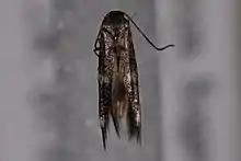 The wingspan is 8.5-9.5 mm. The forewings are fuscous, the bases of the scales whitish. The hindwings are pale grey.[2] Adults have been recorded on wing from July to August.