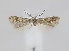 The length of the forewings is 3.2–3.7 millimetres (0.13–0.15 in) for males and 3.4 millimetres (0.13 in) for females. The forewing ground colour of the females is mottled greyish/brownish from the base to the fascia and blackish beyond. For males, the ground colour of the forewings is greyish brown, with whitish scales basally, resulting in a mottled appearance.[2]