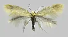 The wingspan is 10–13 millimetres (0.39–0.51 in).The head is ochreous-yellowish. Forewings are ochreous yellow, towards costa sometimes fuscous-tinged. Hindwings are dark grey.[1]