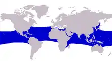The rainbow runner has a circumtropical distribution, inhabiting tropical and some subtropical waters worldwide. In the Western Atlantic, the species occurs from Massachusetts and Bermuda to northeastern Brazil, including the northern and southern Gulf of Mexico, the Bahamas, and the Greater and Lesser Antilles,[12] extending east to at least the Azores.[15] The species is widespread throughout the Pacific Ocean, but appears to be slightly less abundant in parts of the Indian Ocean, and rare or absent in the Persian Gulf.[16] The species is an occasional visitor to the Mediterranean Sea, generally as a Lessepsian immigrant through the Suez Canal, but has not taken up permanent residence like other species.[17] The species also inhabits the nearby Canary Islands, possibly entering the Mediterranean from the east, also.[18]
