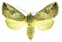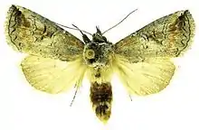 The wingspan is 30–41 mm.[1] The overall colour is light grey blue to grey with obscure transverse forewing markings, sometimes showing slight brownish shadings over the reniform spot and in the postmedial and subterminal areas. Males and females are similar in appearance.[2] Adults are on wing from April to early October.