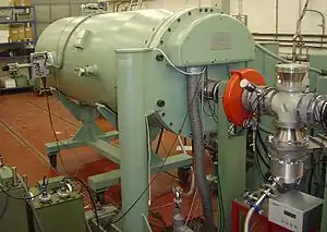 Now that the vapor of the desired has been ionized, they must be removed from the magnetic bottle. To do this, a high voltage is between the hexapoles applied to pull out the ions from the magnetic field.[23] The extraction of the ions, from the chamber, is carried out using an electrode system through a hole in a positively biased plasma chamber.[23] Once the ions have been extracted from the chamber, they are then sent to the cyclotron for acceleration. It is very important that the ion source used is optimal for the experiment being carried out. To perform an experiment in a practical amount of time, the ions provided from the accelerator complex should have the correct desired energy.[23] The quality and stability of the ion beam needs to be considered carefully, due to the fact that only the ions with the correct flight trajectory can be injected in the cyclotron and accelerated to the desired energy.[23]