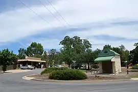![]() The main street of Eldorado. A Soldiers Memorial bus shelter is in the foreground while the General store and McEvoy Tavern ("The smallest pub in Victoria") can seen to the left. | |