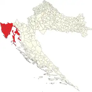 - western part of Primorje-Gorski Kotar County including cities and municipalities: Baška, Cres, Crikvenica, Dobrinj, Kostrena, Kraljevica, Krk, Lovran, Mali Lošinj, Malinska - Dubašnica, Matulji, Mošćenička Draga, Omišalj, Opatija, Punat, Rab, Rijeka, Vrbnik.