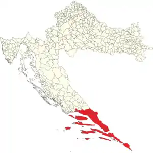 - southern part of Split-Dalmatia County including cities and municipalities: Baška Voda, Bol, Brela, Cista Provo, Dugi Rat, Gradac, Hvar, Imotski, Jelsa, Komiža, Lokvičići, Lovreć, Makarska, Milna, Nerežišća, Omiš, Podbablje, Podgora, Podstrana, Postira, Proložac, Pučišća, Runovići, Selca, Solin, Split, Stari Grad, Sućuraj, Supetar, Sutivan, Šestanovac, Šolta, Tučepi, Vis, Vrgorac, Zadvarje, Zagvozd, Zmijavci;