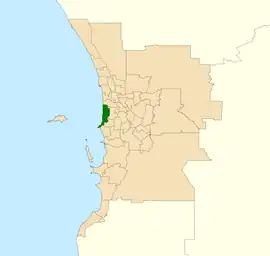 As at the 2007 redistribution, Cottesloe is bounded by Loch Street and Brockway Road to the east, Perry Lakes and Bold Park to the north, the Indian Ocean to the west, and the Swan River to the south and southeast. It includes the suburbs of Claremont, Cottesloe, Mosman Park, Mount Claremont, North Fremantle, Peppermint Grove and Swanbourne.[6] Major features within the electorate include Campbell Barracks (Australia), The Grove Library and The Grove Community History Library, Cottesloe Beach and several private schools including Scotch College, Christ Church Grammar School, Methodist Ladies' College and Presbyterian Ladies' College.