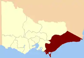 The area of Gipps' Land was defined as: "Bounded on the south and east by the sea on the north by a line running in a westerly direction from Cape Howe to the source of the nearest tributary of the Murray and the Australian Alps again on the west by the Alps and the Counties of Evelyn and Mornington."[1]
