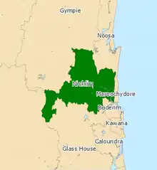 Nicklin is an electoral district of the Legislative Assembly in the Australian state of Queensland. The electorate is centred in the Sunshine Coast hinterland, and stretches north to Black Mountain, south to Palmwoods and Montville, and west to Kenilworth, including Conondale National Park. It includes notable localities such as Nambour, Yandina, Cooroy, Bli Bli, Mapleton and Woombye.[1]