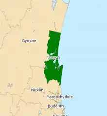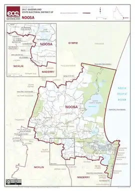 Noosa is a Legislative Assembly of Queensland electoral district in the Australian state of Queensland. The electorate is centred on Noosa and stretches northwest to the southern border of Gympie, south to Peregian Springs and west to Eumundi.[1]