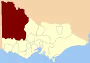 It was defined initially as "Bounded on the West by the Boundary Line of Victoria and South Australia; on the North by the River Murray; on the East by a Line to Lake Bael Bael, thence by the River Avoca to its Source; and on the South by the Boundaries of the Counties of Follett, Dundas and Ripon".[1]