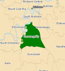 Yeerongpilly was bordered by the Brisbane River and Oxley Creek to the north and west, while the electoral districts of Greenslopes, Mansfield, South Brisbane and Sunnybank bordered it on the east and south. The division included suburbs in Brisbane's inner south, including Annerley, Fairfield, Moorooka, Nathan, Rocklea, Salisbury, Tarragindi, Yeronga and Yeerongpilly. Many landmarks, including the Nathan campus of Griffith University and the Queensland Sport and Athletics Centre fell in the electorate.[2][3]