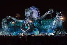 The event features electronic dance producers and DJs, and incorporates a variety of electronic music, including house, techno, drum and bass, and dubstep.[2] In addition to the music, event goers experience three-dimensional superstructures, colorful glow-in-the-dark environments, and LED lit flora and fauna.[3] There are also interactive art installations throughout EDC, free roaming carnival performers, and carnival rides.[3]