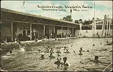 The second Kansas City Electric Park, this time at 46th Street and the Paseo, opened 19 May 1907. Like the first one, it was a trolley park (this time served by the Troost Avenue, Woodland Avenue, and Rockhill lines of the Metropolitan Street Railway Company),[5] but the successor was one of the largest (if not the largest) ever to be called Electric Park. It had "band concerts, vaudeville, Electric Fountain, ballroom, natatorium, German village, alligator farm, chutes, Dips Coaster, Norton slide, penny parlors, novelty stand, Japanese rolling ball, scenic railway, pool room, a Hale's Tour of the World, Electric Studio, boat tours, old mill, a Temple of Mirth, Flying Lady, Double Whirl, Circle Swing, soda fountain and ice cream shops, knife rack, doll rack, shooting gallery, air gun gallery, giant teeter, boating, outdoor swimming, carousel, clubhouse cafe, Casino 5 cent theater, fortune telling and palmistry, covered promenade and horseless buggy garage."[6] Souvenirs from the park touted it as "Kansas City's Coney Island,"[7] which it matched by having 100,000 light bulbs adorn its buildings.[8]