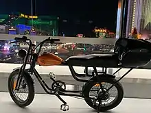 An Electric Pusher Trailer is an e-bike design which incorporates a motor and battery into a trailer that pushes any bicycle. One such trailer is the two-wheeled Ridekick. Other, rarer designs include that of a 'chopper' styled e-bike, which are designed as more of a 'fun' or 'novelty' e-bike than as a purposeful mobility aid or mode of transport.
