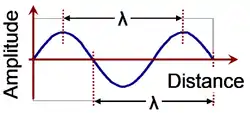 Electrical length is defined for conductors carrying alternating current (AC) at a single frequency or narrow band of frequencies. An alternating electric current of a single frequency is an oscillating sine wave which repeats with a period of .[5] This current flows through a given conductor such as a wire or cable at a particular phase velocity . It takes time for later portions of the wave to reach a given point on the conductor so the spacial distribution of current and voltage along the conductor at any time is a moving sine wave. After a time equal to the period a complete cycle of the wave has passed a given point and the wave repeats; during this time a point of constant phase on the wave has traveled a distance of