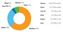 In 2013, the leading type of power generation by utilities in Canada is hydroelectricity, with a share of 60.1%. Nuclear (15.8%), natural gas (10.3%), coal (10%), wind (1.8%), fuel oil (1.2%), biofuels and waste (0. 8%), wood (0.4%) and solar (0.1%) follow. Other sources, such as petroleum coke make up the remaining 0.5%.[25][26][27]