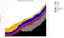 Electricity in the Philippines is produced from various sources such as coal, oil, natural gas, biomass, hydroelectric, solar, wind, and geothermal sources. The allocation of electricity production can be seen in the table below, according to data from the Department of Energy Power Statistics:[6]