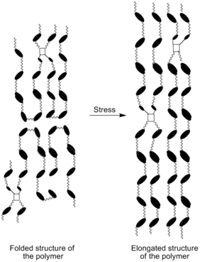Main-chain liquid crystalline polymers have mesogenic groups linked to each other by a flexible spacer. The mesogens within a backbone form the mesophase structure causing the polymer itself to adopt a conformation compatible with the structure of the mesophase. The direct coupling of the liquid crystalline order with the polymer conformation has given main-chain liquid crystalline elastomers a large amount of interest.[14] The synthesis of highly oriented elastomers leads to have a large strain thermal actuation along the polymer chain direction with temperature variation resulting in unique mechanical properties and potential applications as mechanical actuators.