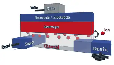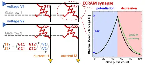Electrochemical Random-Access Memory (ECRAM) is a type of non-volatile memory (NVM) with multiple levels per cell (MLC) designed for deep learning analog acceleration.[1][2][3] An ECRAM cell is a three-terminal device composed of a conductive channel, an insulating electrolyte, an ionic reservoir, and metal contacts. The resistance of the channel is modulated by ionic exchange at the interface between the channel and the electrolyte upon application of an electric field. The charge-transfer process allows both for state retention in the absence of applied power, and for programming of multiple distinct levels, both differentiating ECRAM operation from that of a field-effect transistor (FET). The write operation is deterministic and can result in symmetrical potentiation and depression, making ECRAM arrays attractive for acting as artificial synaptic weights in physical implementations of artificial neural networks (ANN). The technological challenges include open circuit potential (OCP) and semiconductor foundry compatibility associated with energy materials. Universities, government laboratories, and corporate research teams have contributed to the development of ECRAM for analog computing. Notably, Sandia National Laboratories designed a lithium-based cell inspired by solid-state battery materials,[4] Stanford University built an organic proton-based cell,[5] and International Business Machines (IBM) demonstrated in-memory selector-free parallel programming for a logistic regression task in an array of metal-oxide ECRAM designed for insertion in the back end of line (BEOL).[6] In 2022, researchers at Massachusetts Institute of Technology built an inorganic, CMOS-compatible protonic technology that achieved near-ideal modulation characteristics using nanosecond fast pulses [7]