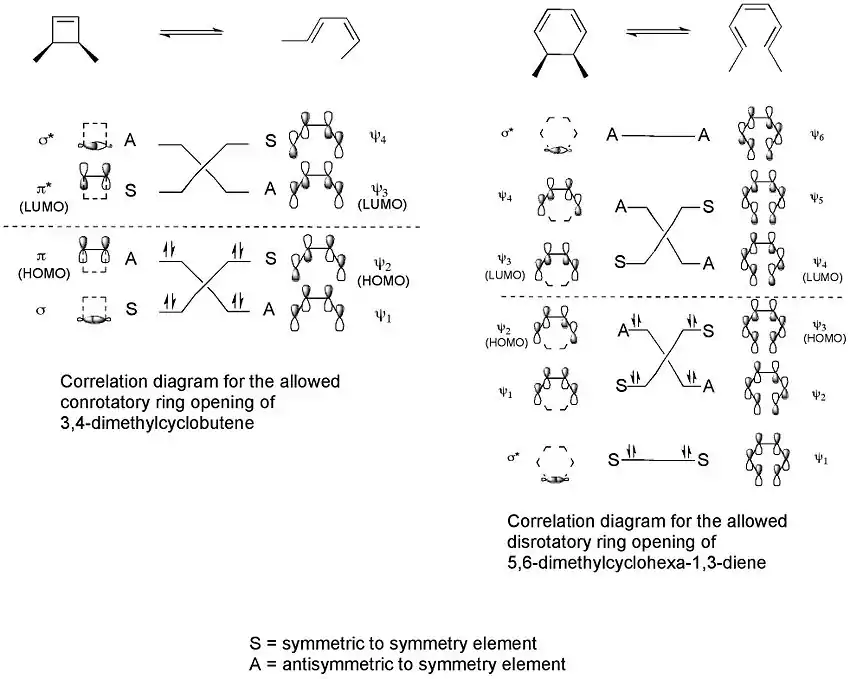 Correlation diagrams, which connect the molecular orbitals of the reactant to those of the product having the same symmetry, can then be constructed for the two processes.[3]