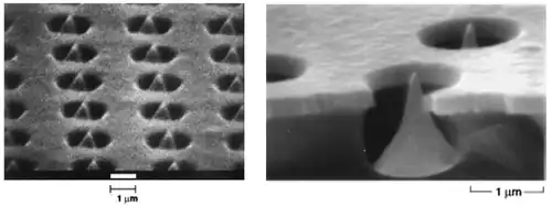 Field emission cathodes are often in the form of Field Emitter Arrays (FEAs), such as the cathode design by Spindt et al. The figure below displays close up visual images of a Spindt emitter.[46][47][48]