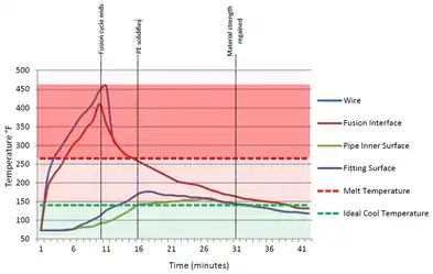 As fusion time begins, there is an incubation period where no strength develops. Once enough time has passed for the molten material to begin solidifying, the joint strength begins to develop before plateauing at the maximum strength. If power is applied after full joint strength is achieved, the strength will start to decline slowly. [5][11]